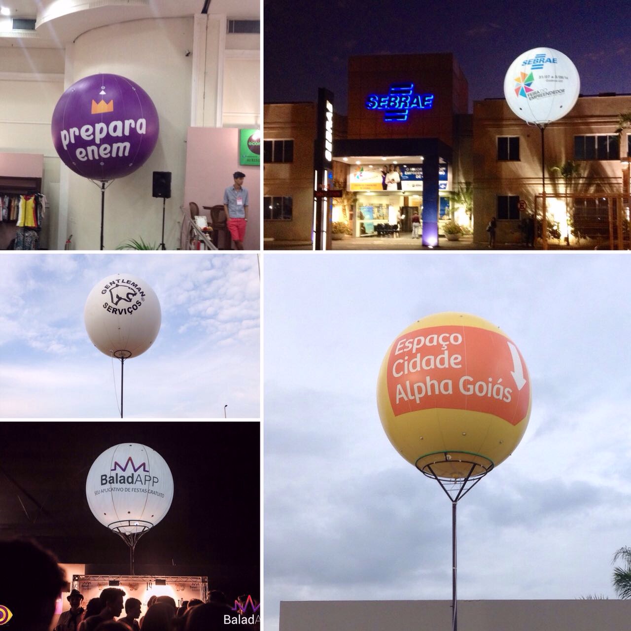 Pvc pneumático 0,23mm. Inflado com gás hélio, não inflamável, personalizado. Possui iluminação interna como opcional. Flutua até 20 metros de altura.